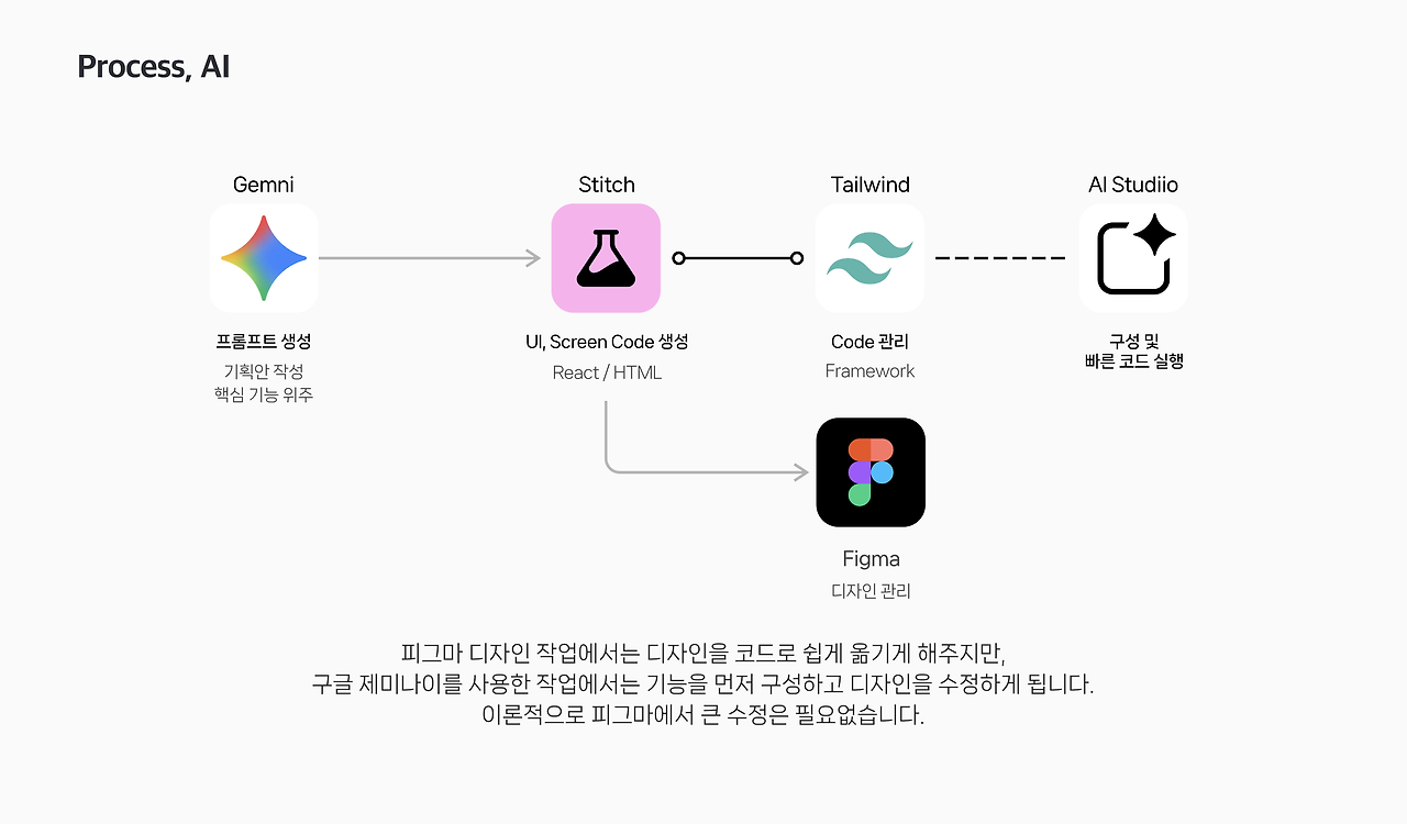 AI를 사용한 프로세스는 Figma의 프로세스에서 숙련도를 더 제거하고, 디자인 리소스의 조달을 통합한 상태입니다. 이론적으로 제미나이는 아주 적은 정보만 주어도 숙련된 UX 디자이너나 프로덕트 디자이너처럼 좋은 제품을 만들 수 있는 조언을 해줍니다.