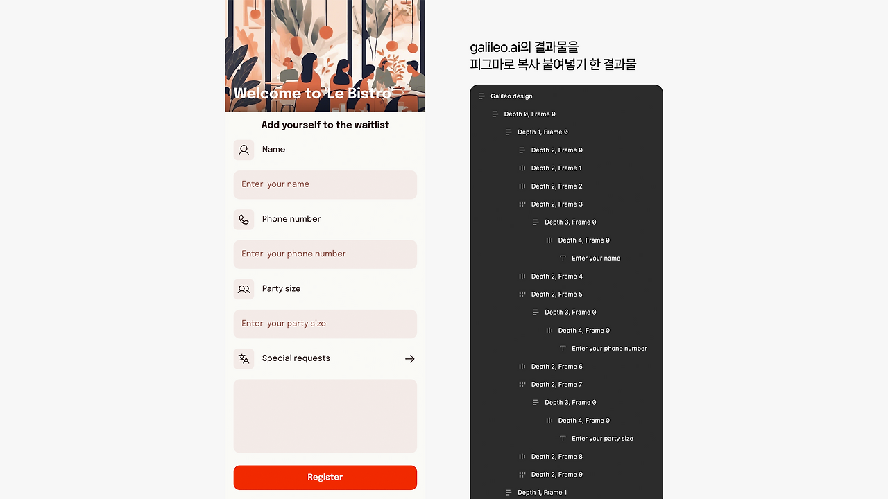 피그마는 AI 프로세스에서는 조금 더 보조적인 역할을 수행합니다. 스티치에서 생성한 디자인을 가져오는 일은 이전 갈릴레오 AI 때와 같고, 레이어의 구조도 구성되어 있지만, 여전히 여기서 디자인을 진행하는 것은 어려운 일입니다.