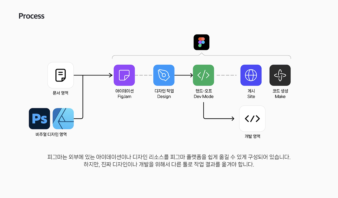 피그마는 디자인 업무에서 작업의 통합과 일관성 있는 기준을 적용하는 프로세스를 만들어냈습니다. 숙련도가 낮아도 정리된 작업 환경에서 디자인 리서스를 운영할 수 있게 되었습니다.