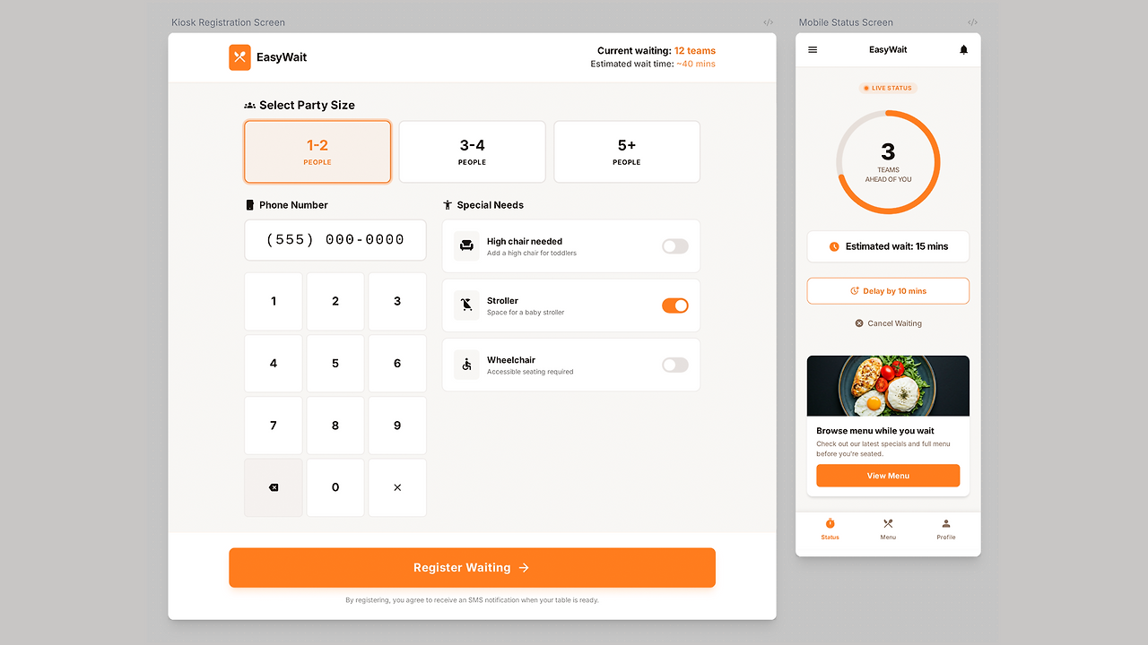 "이제 세부적인 부분에 집중하여 등록과 상태 확인 모두에 대한 사용자 흐름을 설계하고 있습니다. 이미지 생성 도구를 활용한 시각적 표현과 간결한 UX 설명 작성에 주력하고 있습니다. 등록 UI는 크고 명확한 버튼과 직관적인 입력 과정을 강조할 것입니다. 상태 확인 화면에서는 대기 시간, 순서, 대기열 번호를 이해하기 쉬운 방식으로 표시해야 합니다."