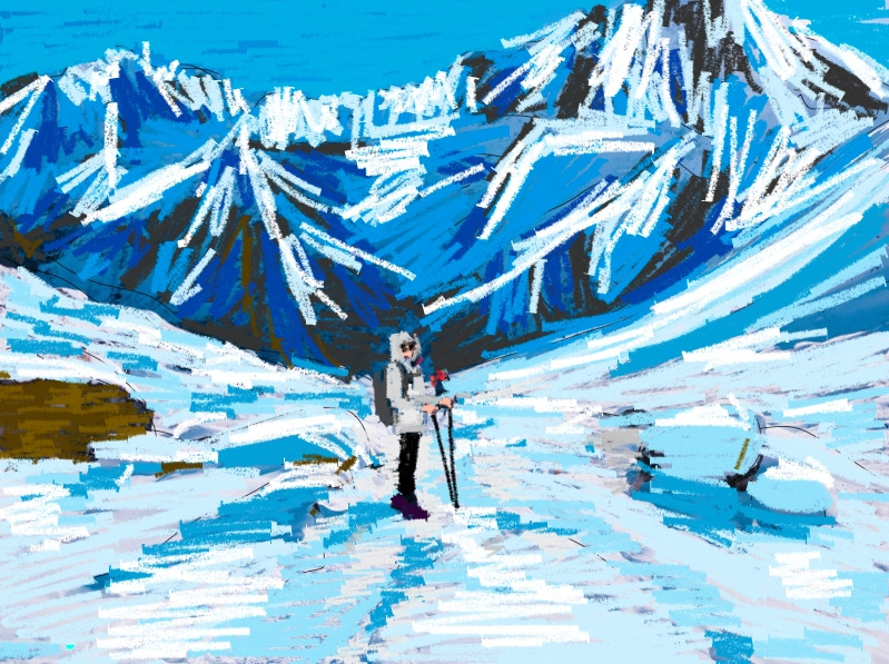 MBC를 지나서도 눈이 계속 쌓여있다. 아랫마을에도 눈이 내렸었나보다. 산에 삼각형 모양으로 엄청나게 크게 눈이 쌓여있는 구간이 있었는데 폭포가 얼어붙어서 눈이 쌓여있는 거였다. 멀리서 봤을 때는 저기 꼭대기에서 눈썰매타면 재밌겠다고 생각했는데 가까이서 보니 전혀 올라가고 싶은 생각이 들지 않았다. 눈이 얼어붙어 있는 구간을 지나가야 하는데 꼭대기에서 눈 부스러기 같은 것이 떨어진다. 너무 놀라 씨얀을 바라보니 이 구간이 위험구간이니 빠르게 지나가라고 한다. 잔뜩 겁을 먹고 정말 빠르게 경보로 지나왔다. 허리까지 얼음이 얼어있고 그 위로 눈이 쌓여있었다. 갈라진 틈 사이로 보이는 얼음의 모습이 생야생의 것이다. 눈썰매 취소,취소.