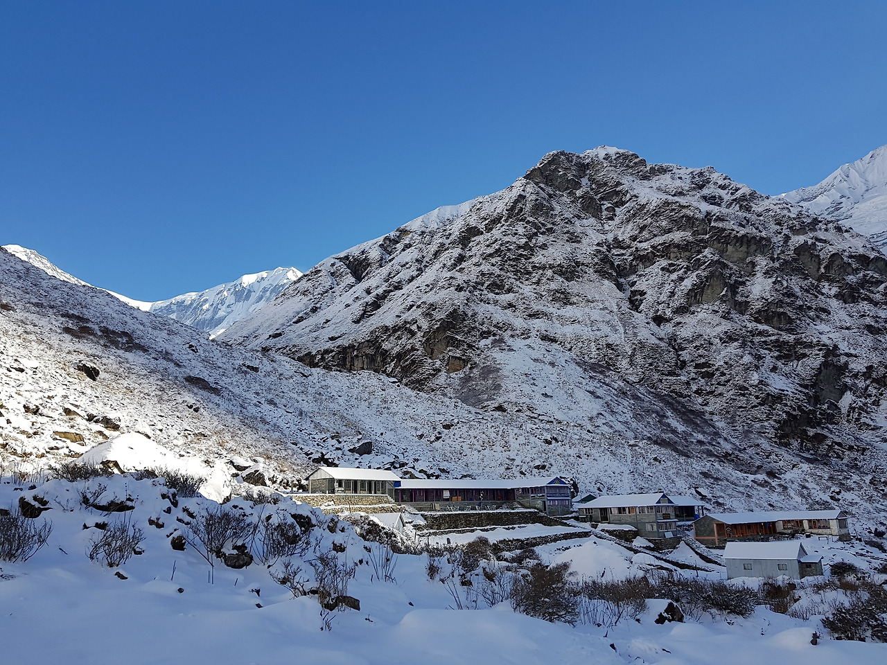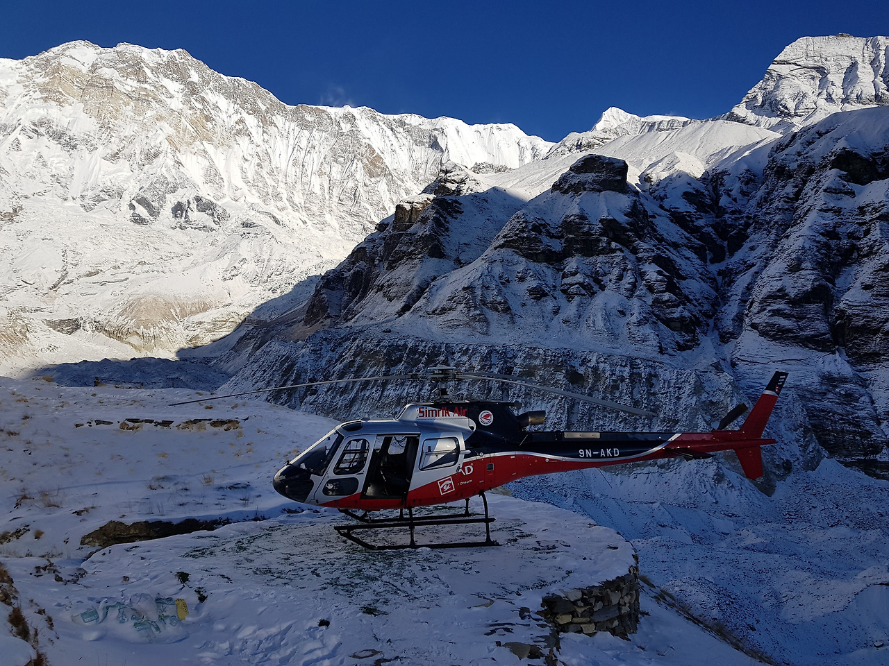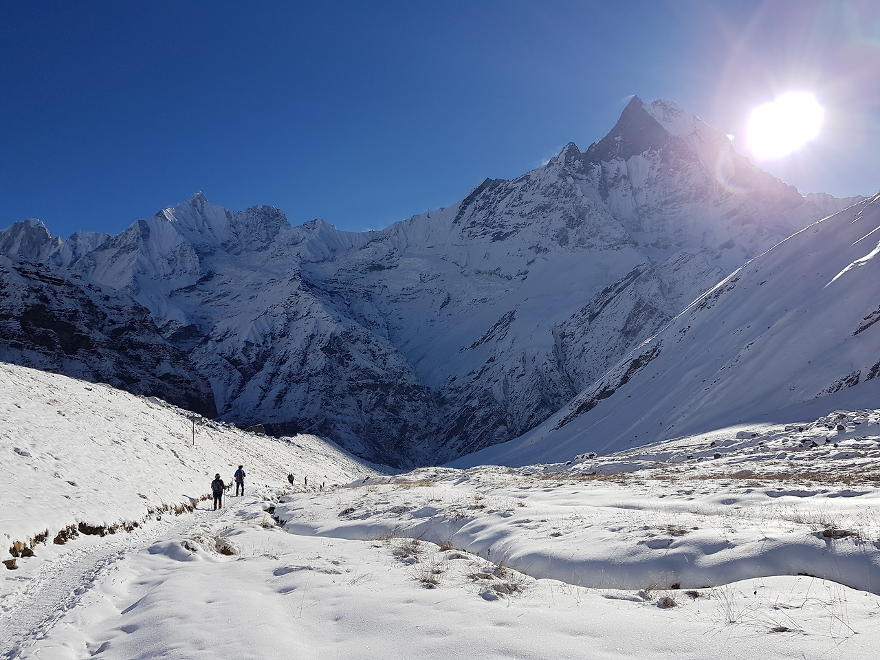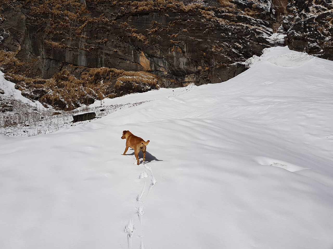 마차푸차레 옆으로 해가 높이 떴다. 히말라야에 와서 경험할 수 있는 건 다 경험해보는 것 같다. 눈 맞으면서 산행도 해보고, 반팔입고 산행도 해보고, ABC와 푼힐에서 맑은 하늘의 일출도 보고, 별도 원없이 보고. 우리 정말 운이 좋다며 감탄하며 걸어가는데 헬기가 내려간다. 아까 그 중국 아주머니께서 이제 내려가나보다. 헬기가 마차푸차레 쪽으로 쭉 가더니 마치 산에 박으면 어쩌나 싶을 정도로 산 가까이 간다. 물론 실제로는 아직도 먼 거리에 있었겠지만. 그러더니 골짜기 사이로 사라져갔다. 하늘 위에서 산들을 더 가까이서 보는 풍경도 너무 멋질 것 같았다. 우리 한번 걸어봤으니 다음에는 헬기를 타고 오자고 약속을 한다. 어제 눈이 많이 내려서 눈이 제법 쌓였다. 눈 내린 산 모습이 더 멋있어졌고 내려가는 길도 푹신푹신한 눈을 밟으면서 가니 수월하게 내려갈 수 있었다. 마차푸차레를 정상에 쌓인 눈이 바람에 흩날리는 모습을 보고 노빈이 한마디 한다. 'Machapuchare smoking, huh?' 그 말이 너무 절묘해서 우리는 말그대로 빵 터졌다. 어제는 너무 멀고 힘든 길이었는데 오늘은 MBC까지 금새 내려왔다.