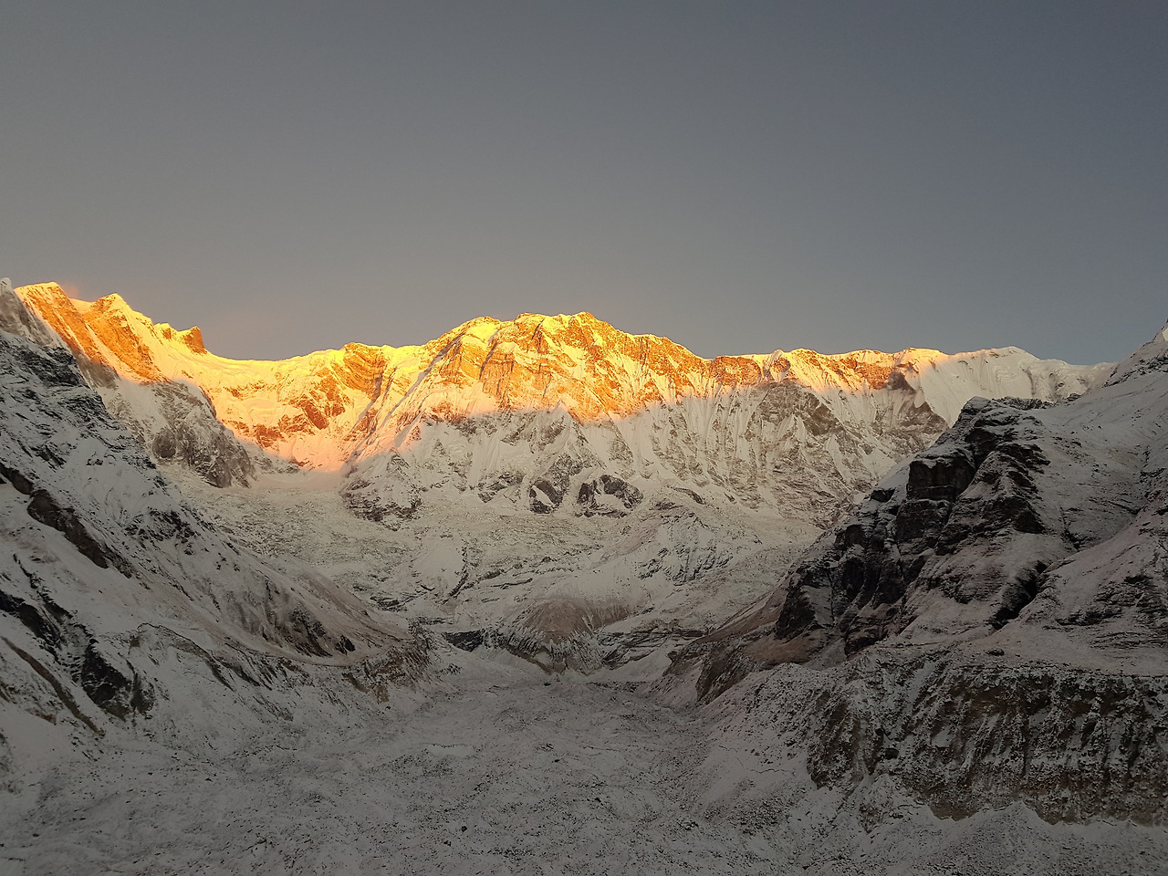 안나푸르나에서 일출을 맞이하기 위해 새벽 5시반부터 일어났다. 다행히 날이 맑아서 일출을 볼 수 있을 것 같다. 힌출리~안나푸르나 남봉~안나푸르나 3봉~강가푸르나~안나푸르나 1봉~마차푸차레가 ABC를 둘러싸고 있다. 어쩜 베이스캠프 위치도 이리 잘 잡았는지 산들을 보다보면 한바퀴 두바퀴 계속 빙글빙글 돌게 된다. 고도가 높아서인지 내가 나인지도 못알아 볼 만큼 얼굴이 팅팅 부어 예쁘게 사진을 못남겨서 아쉬웠다. 이게 다 고도때문이라고 해두자. 여기와서 보니 푼힐에서 본 안나푸르나는 안본거나 마찬가지다. ABC에서 봐야지 진짜 안나푸르나를 봤다고 할 수 있다. 우리끼리 푼힐만 본 사람은 안나푸르나 봤다고 인정 안해주기로 했다. 일출을 기다리며 ABC 자부심이 생겼다. 안나푸르나 남봉을 보면서 과연 안나푸르나를 오르는 사람들은 어디로 올라가는지 궁금해졌다. 와. 저길 어떻게 올라가지? 베이스 캠프에서 바라봐도 너무나 험해보이는데. 씨얀에게 저기 올라가는 사람들은 어디로 올라가는거냐고 물었더니 'Very dangerous.'라는 답이 돌아왔다. 그래, 한국가면 영어공부할께. 발이 시려운 것도 참으면서 넋놓고 산맥들을 감상하고 있는데 노빈이 아침먹을 시간이라면서 우리를 데리러 왔다. 7시에 아침먹기로 되어있었는데 어느새 7시가 지나있었다.