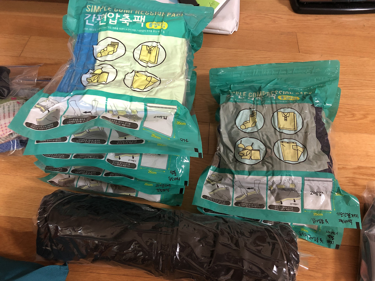지퍼백이나 봉지에 나누어 담으면 나누어 담을 수록 냄새도 안배고 짐 갖고 다니기도 편하다는 이야기를 들어서 작은 사이즈의 압축팩을 여러개 사서 옷을 다 나누어 담았다. 투명해서 내용물이 다 보이지만 그래도 구분하기 편하도록 네임펜으로 봉투에 내용물을 적어두었다. 포터에게 짐을 맡길 때 10kg이 들어가는 엄청 큰 배낭에 짐을 넣어서 맡기기 때문에 부피를 줄여주는 압축팩이 아주 요긴하게 쓰였다. 뿐 만 아니라 캐리어에 넣을 때도 꾹꾹 눌어담기 아주 편리하다. 여행 필수품이다.
