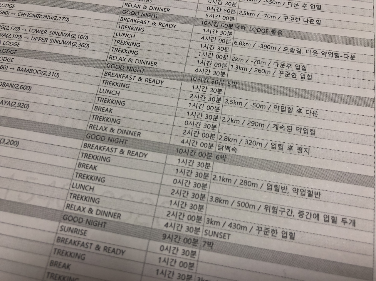 스케줄을 짜보니 생각보다 트레킹이 할 만할 것 같았다. 보통 아침 7~8시경에 트레킹을 시작하고 3~5시경에 롯지에 도착할 수 있는 스케줄이었다. 점심도 한시간~한시간반 정도 충분히 휴식을 취할 수 있도록 반영했다. 스케줄을 보면서 머릿속으로 이미지 트레이닝을 했다. 머릿속으로 안나푸르나 10번도 더 올라갔다 온 것 같다.