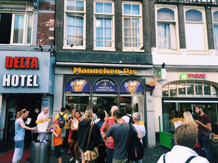 암스테르담, 여행, 맛집이라는 키워드로 검색을 하면 정말 많은 블로거들이 마네킨 피스를 소개한다. 감자튀김 하면 떠오르는 나라 벨기에와 마찬가지로 마요네즈를 뿌려준다고 한다. 밀라노 엑스포에서 벨기에 감자튀김을 먹어보았는데 맛이 크게 다르진 않은 것 같았다. 오랜 시간 걸어 다녀 발바닥이 조금 아팠기 때문에, 저기 보이는 꼬마 아이 옆에 꽂아두고 서서 먹었다. 여행객으로 보이는 사람들은 나를 비롯해 서서 맛있게 먹는 사람들 표정을 유심히 살피는 것 같았고, 암스테르담에 사는 사람들은 '여긴 오늘도 사람이 많네'하며 슥 지나쳐가는 것 같았다.