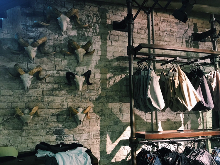 입구 재봉틀도 멋졌지만 지하의 오브제가 더 마음에 들었다. 벽돌로 채워진 벽면도 하수구를 떼다 박은 것 같은 선반 프레임도 마음에 들었다.
