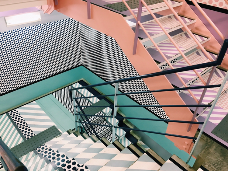 오모테산도는 한적한 듯 보이지만 구석구석 뜯어보면 엄청 자극적인 동네다. 신주쿠나 시부야처럼 휘황찬란한 간판도 적고 사람도 상대적으로 덜 붐비지만, 각 매장에 들어서면 눈이 돌아간다. 오프닝 세러모니(Opening ceremony)는 워낙 화려한 브랜드들을 많이 들여놓았기 때문에, 꼭 오모테산도여서 화려한 것은 아니겠다만. 과감한 컬러 조합과 패턴으로 이루어진 시트지, 인테리어 부자재, 네온사인과 형광등 조명 등이 그러하다. 내가 좋아하는 컬러를 한 곳에 모아놓은 층간 공간은 지금 봐도 너무 예쁘다. 블랙 앤 화이트에 민트와 코랄 컬러라니.