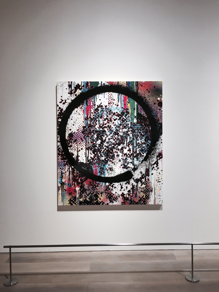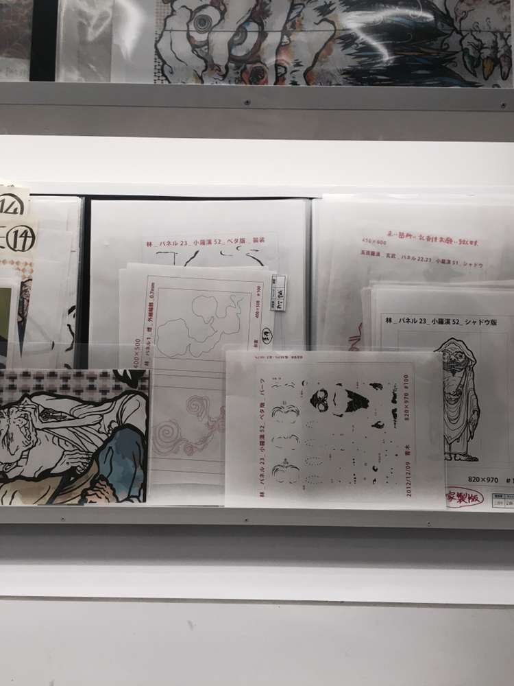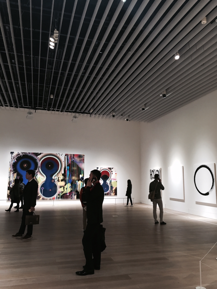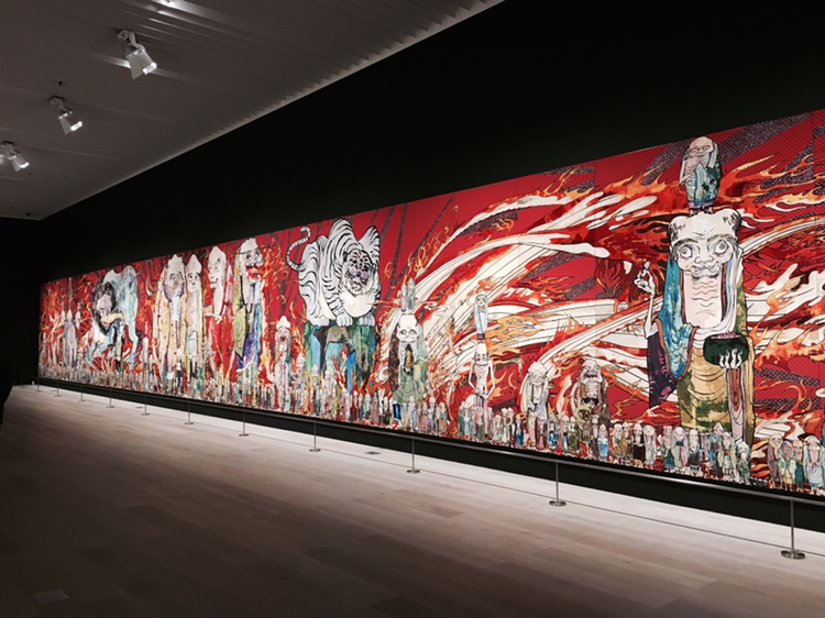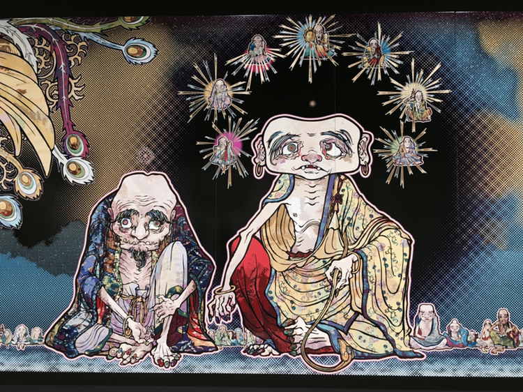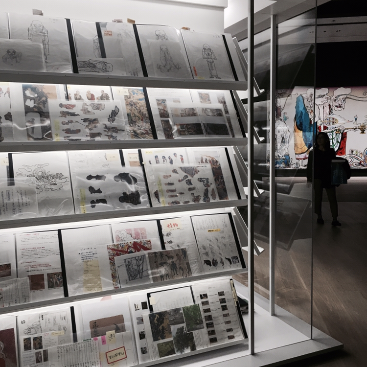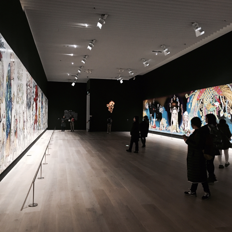 본격적인 '오백나한도'가 펼쳐지기 전, 시원시원한 전시 공간에 다양한 그의 작품들이 그룹핑되어 있다. 눈에 익은 캐릭터도 보이고, 거대한 사이즈의 금색 조형물도 보이고, 원과 스컬을 소재로 한 그림들이 꽤나 강렬하다.
