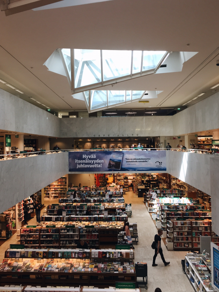 헬싱키에 가기로 마음먹었을 때 아카데믹 서점(Academic Bookstore) 사진을 우연히 보았고, 지나가다 꼭 한 번 들려야지 마음먹었다. 오전에 집을 나서 번화가로 걸어가다 찾게 되었는데, 웬걸. 사진이 다였다. 그렇다고 실망한 것은 아니다. 높에 뚫린 층고와 헬싱키의 강한 오전 햇살을 투과시키는 채광 좋은 창이 마음에 들었다. 알록달록한 책 표지의 색들을 빼곤 흰색, 밝은 회색, 어두운 원목이 차분하게 들어차 있어 따뜻한 느낌이었다.