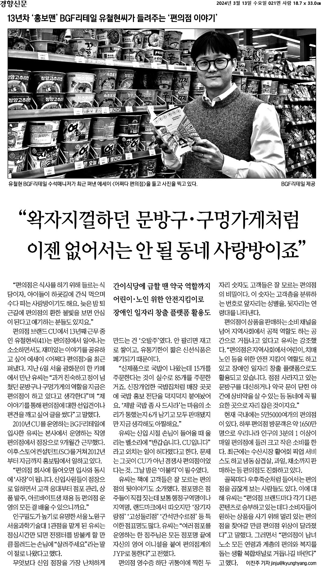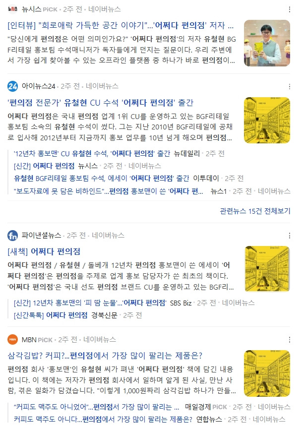 아무튼 책이 서점에 깔리고 온오프라인으로 판매가 시작되자 <어쩌다 편의점>의 소개 기사들이 기대 이상으로 많이 쏟아져 나왔다.'편의점 홍보맨이 처음 쓴 책, 전지적 홍보맨 시점 편의점 이야기, 보도자료에 다 담지 못한 편의점 비하인드'란 프레임이 기자 분들에게 재밌게 보였나 보다. 출판사에서도 원래 에세이는 기사에서 그리 많이 다뤄지는 분야가 아닌데 우리 책이 이렇게 뜨거운 관심을 받을 줄 몰랐다고 했다. 특히, <어쩌다 편의점> 기사 중 하나는 네이버 뉴스 메인에도 걸렸다. 매우 이례적인 일이었다. '편의점에서 가장 많이 팔리는 상품은?'이라는 책 속의 내용을 뽑은 출판사의 보도자료가 큰 반향을 일으킨 것이다. 나의 친구들, 아내의 회사 동료들도 이 기사를 봤다고 하니 나름 많은 사람들에게 닿았던 모양이다.