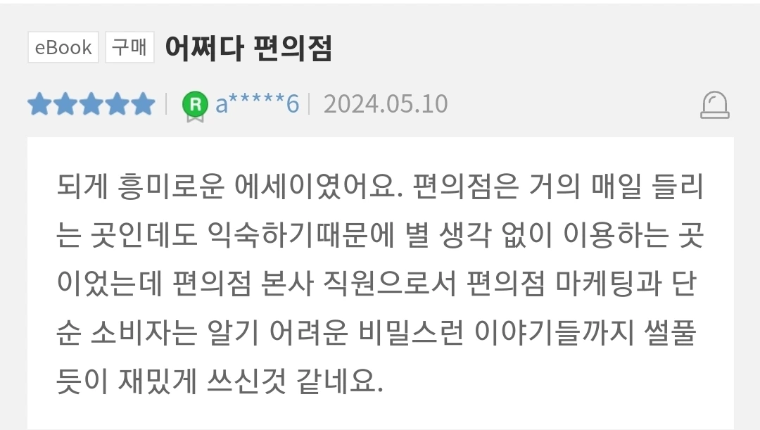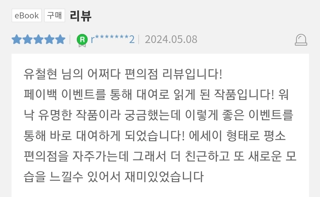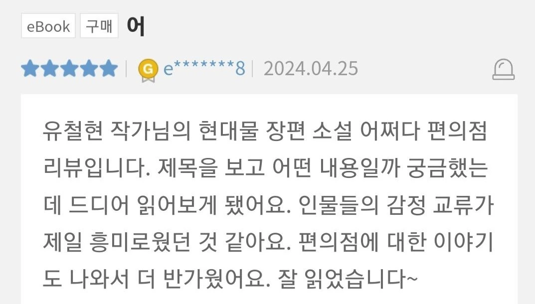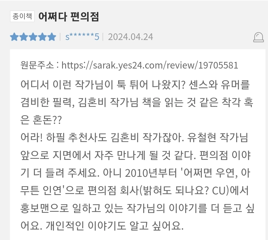 특히, 독자들의 리뷰는출간 작가에게 주어지는 최고의 즐거움이었다. 예스24 <어쩌다 편의점> 페이지에는 총 523개(5/31 기준)의 리뷰와 한줄평이 달렸다. 딱 하나 '그저 그렇네요'란 리뷰를 빼고 나머지 522개 리뷰는-누가 보면 댓글 공작소라도 고용했나 싶을 정도로-모두 다 긍정적이었다. 사실, 갓 나온 무명작가에겐 과찬도 그런 과찬들이 없었다. 편집자님도 말씀하시길 아무리 베스트셀러, 스테디셀러라도 사람들의 관점과 취향이 다 다르기 때문에 이렇게 압도적 호평을 받기는 어렵다고 했다. 기억에 남는 리뷰 몇 가지 소개해 본다.