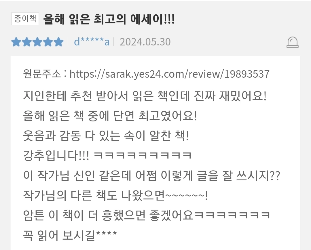 이 분은 과연 무슨 책을 읽으신 걸까? 제 책은 에세이입니다만 아무쪼록 칭찬해 주셔서 감사합니다.