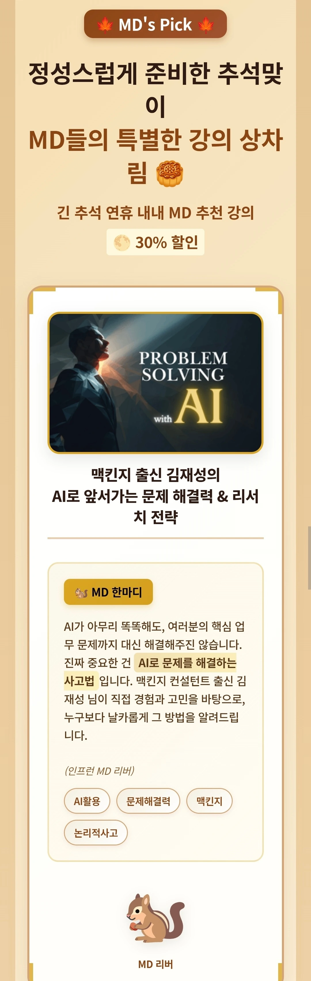 맥킨지 출신 김재성의 AI로 앞서가는 문제 해결력 & 리서치 전략| Jaesung Kim - 인프런 강의 현재 평점 5.0점인 강의를 만나보세요. "AI는 사람을 대체하지 않습니다. AI에 의존하는 사람을 AI를 지배하는 사람이 대체할 것입니다." AI 시대, 더욱 손쉽게 결과물을 만들 수 있는 시대에 더욱
