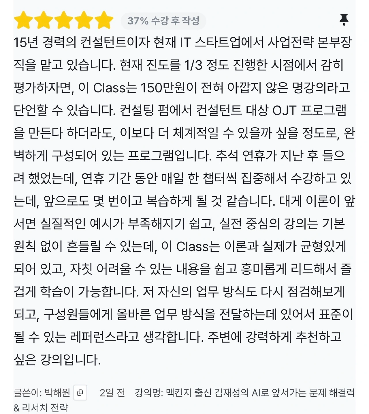 맥킨지 출신 김재성의 AI로 앞서가는 문제 해결력 & 리서치 전략| Jaesung Kim - 인프런 강의 현재 평점 5.0점인 강의를 만나보세요. "AI는 사람을 대체하지 않습니다. AI에 의존하는 사람을 AI를 지배하는 사람이 대체할 것입니다." AI 시대, 더욱 손쉽게 결과물을 만들 수 있는 시대에 더욱