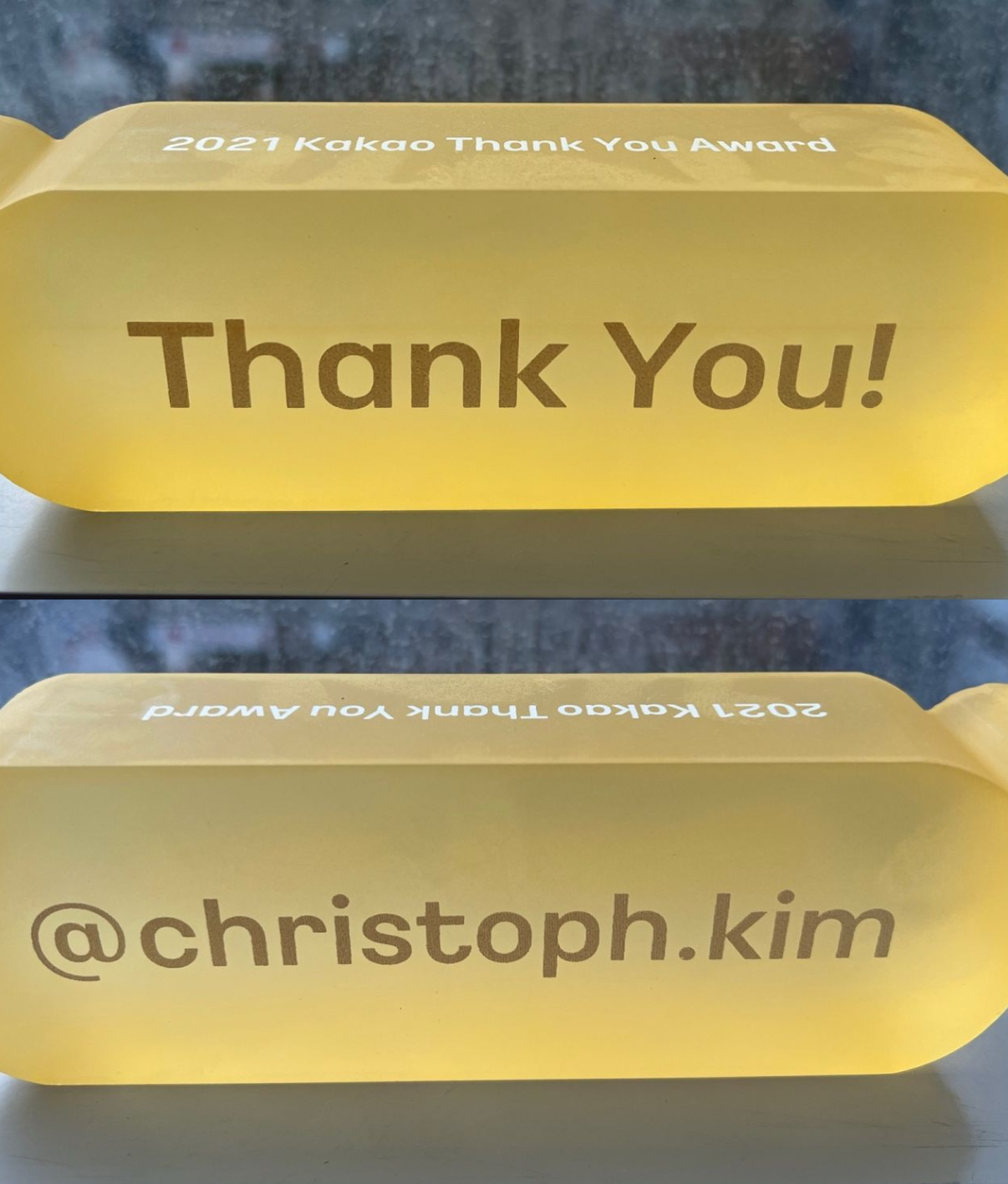 5년 반이라는 커리어에서 한 회사에 머문 가장 긴 기간을 거치며 카카오 구루에 3차례, 우수직원 표창인 Thank you award에도 선정되는 영광스러운 일도 있었습니다. 부족한 저를 좋게 봐주신 동료분들께 감사드립니다.