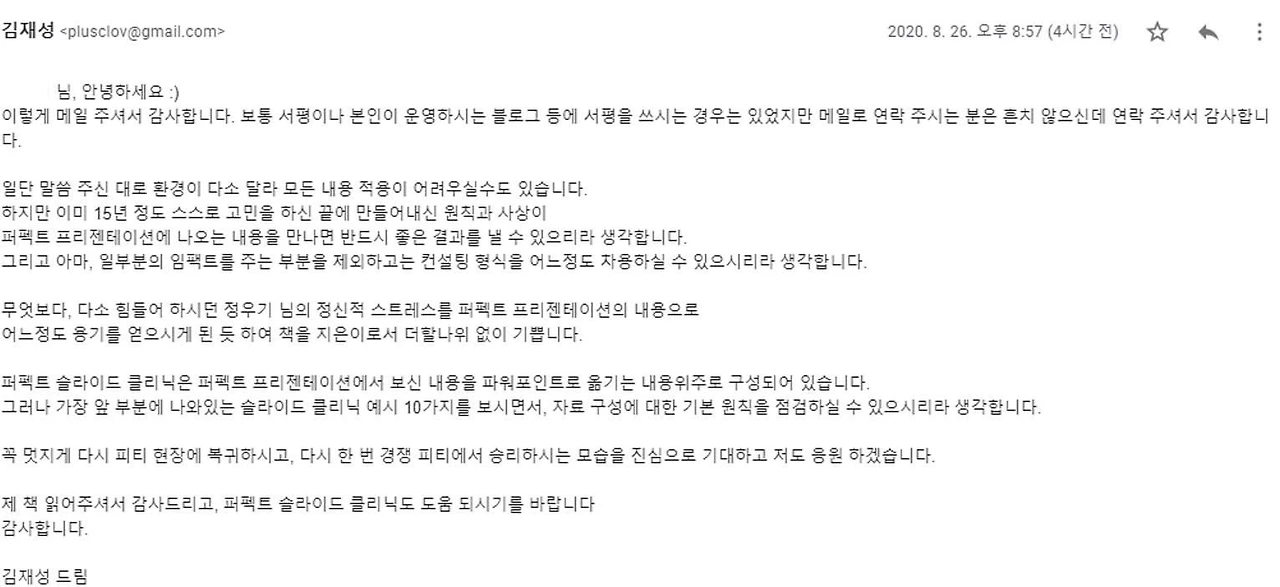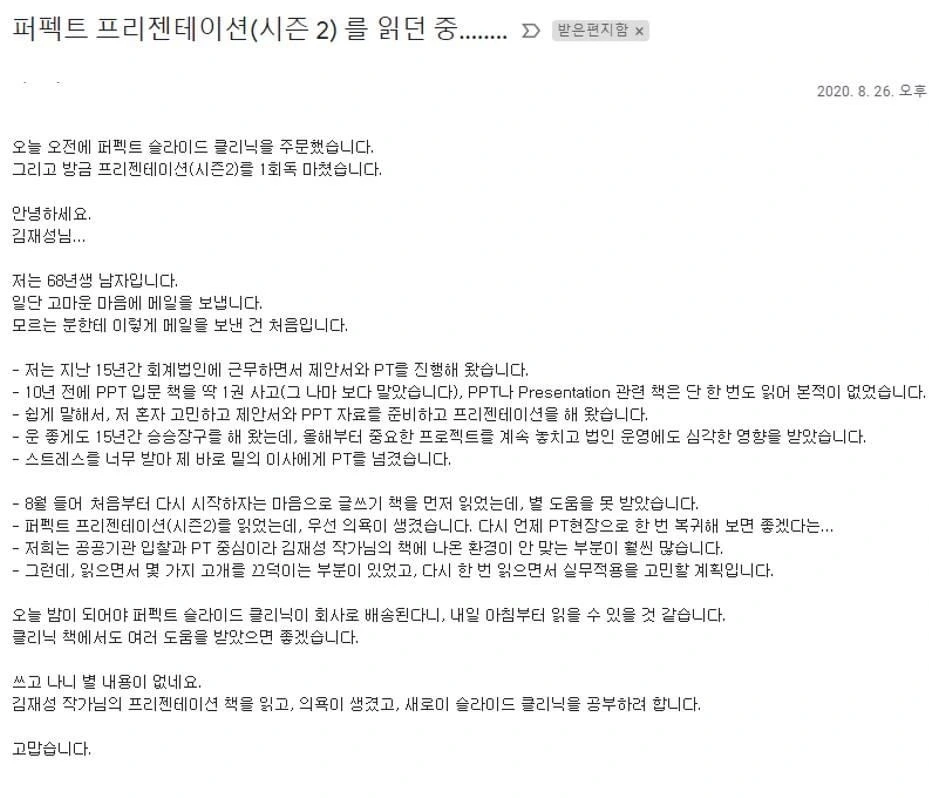 오랜 세월 회사의 주요 피티를 도맡아 오시다, 최근 불운이 겹치신 상태였다고 한다. 독학으로 오랜 세월 승승장구 해 오셨고 다른 책들을 보면서 지식을 얻지 못하다, 이번에 내 책을 보시고 자매작인 퍼펙트 슬라이드 클리닉도 주문하셨다는 내용이었다.