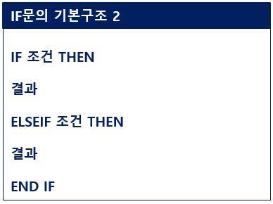 두 번째 IF문의 구조는 복수의 조건을 다룰 때 사용하는 코드이다. 만약 3개일 경우는 ELSEIF를 두 개로 처리하면 된다. 즉 N개의 조건을 처리할 경우에는 N-1개의 ESLEIF문을 처리하면 되는 것이다.