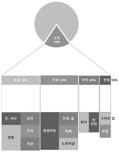 스트레스와 슬럼프가 오면 그 공간에서 떠나는 것이 상책이다. 물론 쉽지 않다. 모두가 그렇게 참고 살아간다. 그래도 많은 사람들은 “도전”(19%)을 꿈꾼다. 어떠한 도전에서도 꼭 “성공”(36%)하리라는 믿음, “은퇴”(34%)후의 삶, 다른 조직으로의 “이직”(20%) 그리고 스스로 사업가의 길을 택한 “창업”(10%)을 고민한다.