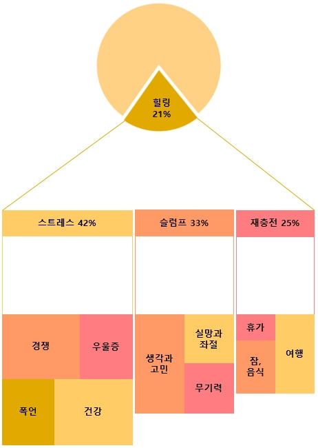 직장생활과 관련된 6개의 주제에서 ‘관계’와 함께 가장 많이 구성된 키워드군은 ‘힐링’이다. 21%의 키워드가 포함되었다. 언제나 피곤한 직장생활에서 작은 쉼표를 찾는 일을 모두의 꿈인 듯하다. 해당 주제내 구성을 살펴보면 스트레스가 42%, 슬럼프 관련 키워드가 33% 그리고 재충전이 25%의 분포를 보였다.