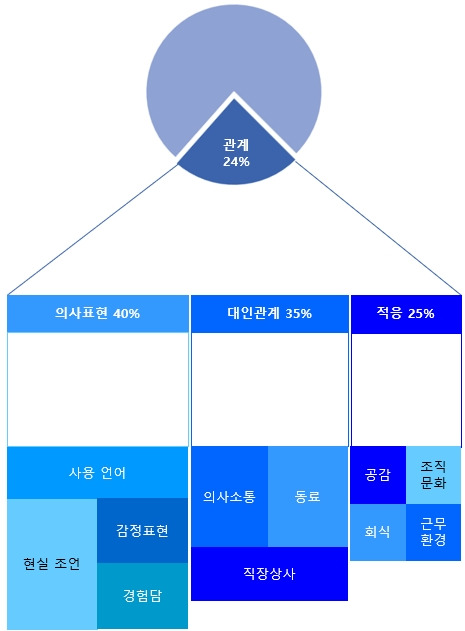 직장생활과 관련된 6개의 주제에서 가장 많은 결과가 나온 것은 인간관계를 설명하는 ‘관계’라는 주제의 키워드 들이다. 전체대비 24%의 키워드가 등장했다. 인간은 사회적 동물인지라 어디서든 대인관계가 핵심인 듯하다. ‘관계’라는 주제에는 다시 3개의 세부 주제들로 구분되는데 각각 ‘의사표현’, ‘대인관계’ 그리고 ‘적응’과 관련된 주제들이다.