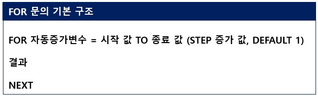 조건문의 핵심은 뭐니뭐니 해도 IF문이다. 그리고 반복문의 핵심은 지금 학습할 FOR문이다. FOR문은 설정된 구간 내에서 결과를 반복하는 구문이다. 반복문이 중요한 이유는 자칫 길어질 수 있는 코드를 단 몇 줄로 간략하게 표현할 수 있기 때문이다.