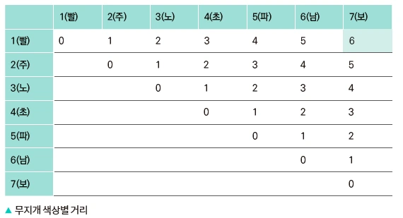 거리란 개념을 이용해 무지개의 색상 간 거리를 표로 정리하면 다음과 같습니다.