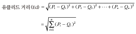 유클리드 거리는 N차원 공간의 두 점 사이의 거리를 측정하는 공식입니다.