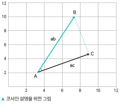 출발점 A로부터 B까지의 거리를 ab, A에서 C까지의 거리를 ac라고 할 때 코사인 A는 다음과 같습니다.