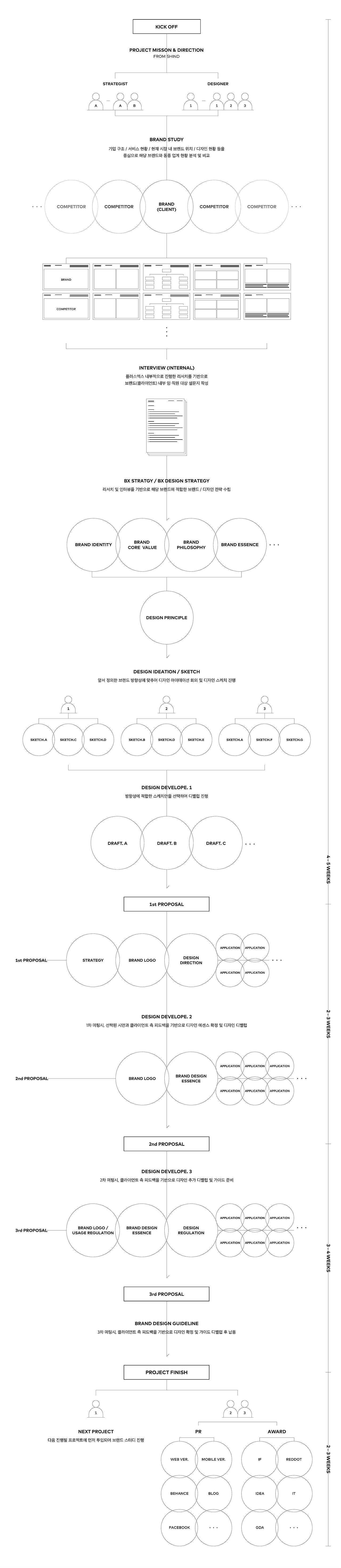 우리는 위와 같이 기본적인 프로세스 구조를 기반으로 프로젝트를 진행하고 있으며, 브랜드마다 차별화된 브랜드 아이덴티티를 갖출 수 있도록 적합한 방향과 시작점을 제공하고자 한다.