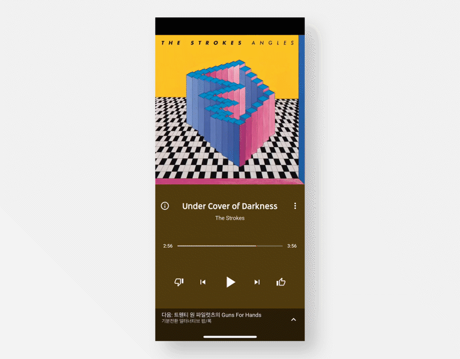유튜브 뮤직은 화면을 스크롤 다운하거나 하단의 다음 곡 알림을 터치하면 재생목록 레이어가 노출되는 방식을 사용하고 있습니다. 하지만 사용자가 여전히 같은 화면 안에 있다고 인지하도록 레이어의 높이를 제한하고 있고, 재생/다음 곡/전체 화면 등의 음악 재생 테스크도 여전히 수행 가능합니다.