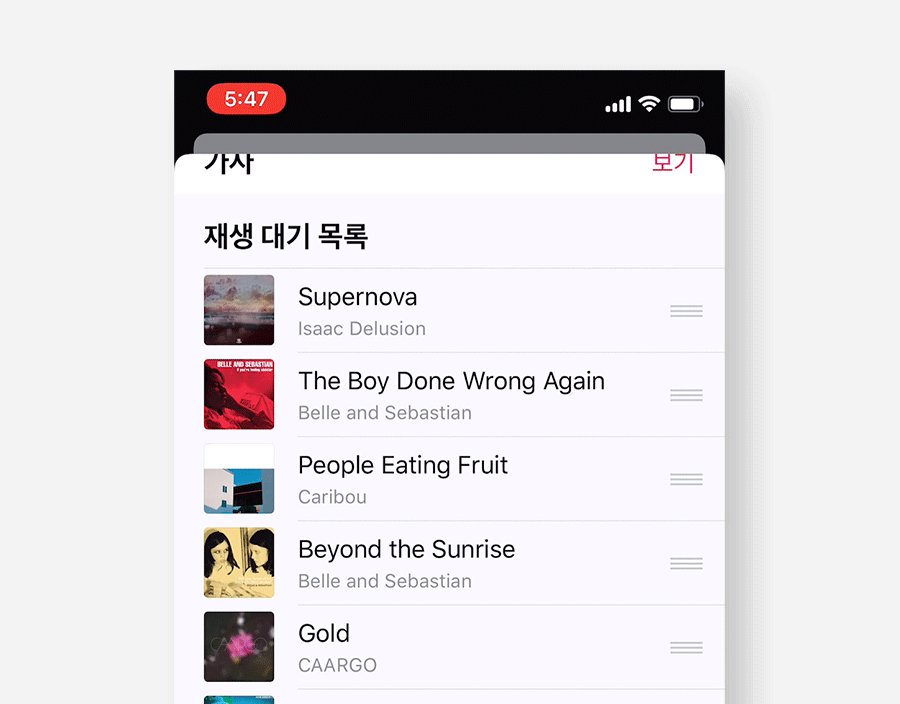 목록 드래그 앤 드롭 가이드라인과 애플 뮤직