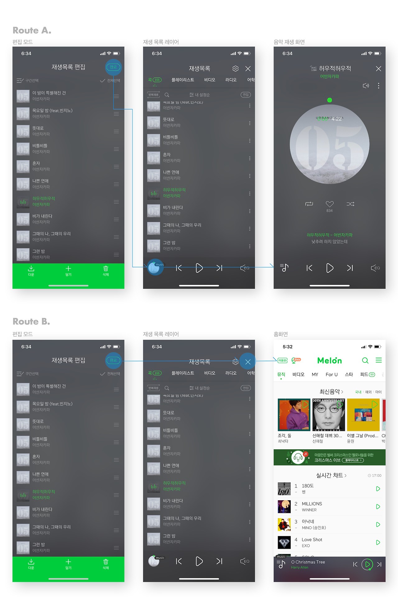 멜론은 음악 재생 화면에서 대기목록 편집까지 [플레이 화면→재생 목록→편집 모드]의 총 3 depth를 거쳐야 하며, 2번의 화면 전환이 발생합니다. 반복되는 화면 전환의 문제점은 테스크를 수행할 때뿐 아니라, 원래 화면으로 돌아올 때 더욱 드러납니다. 원래 화면으로 돌아오려던 사용자는 A루트를 통해 음악 재생 화면으로 돌아오는 대신, 종종 B루트를 통해 의도치 않게 홈 화면으로 이탈하게 됩니다. '편집 [완료]'버튼이 있던 위치에 있는 '재생목록 레이어[닫기]'버튼 때문입니다.(제가 자주 그래요...)