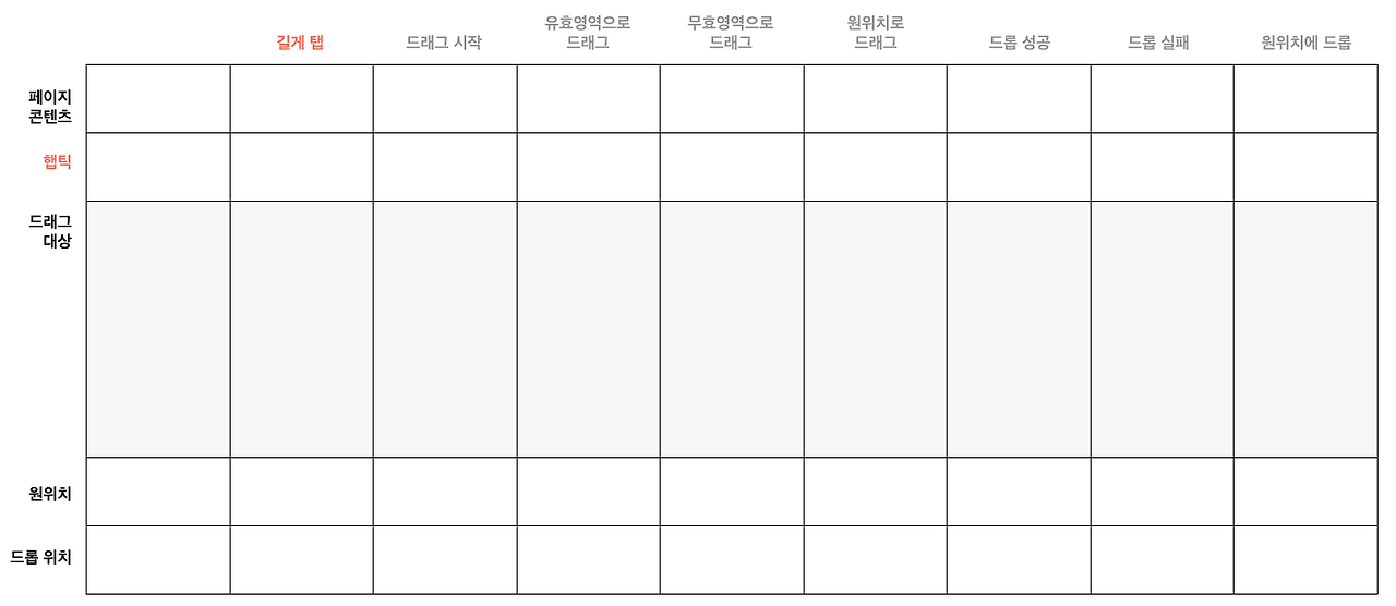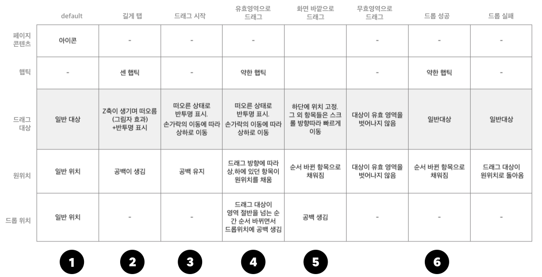 세로축의 첫 번째 행위였던 ‘마우스 오버’의 경우, 모바일에서는 마우스의 역할을 손가락이 대신하고 있으므로 ‘탭’이라는 행위로 바뀔 수 있습니다. 가로축에서 시각적 피드백을 담당하던 '마우스 포인터'는 모바일로 넘어오면서 촉각적 피드백인 ‘햅틱'으로 대체되었습니다. 또 이 외에도 설계하고자 하는 드래그 앤 드롭 상황에 따라 가로축이 추가되거나 변경될 수 있을 것 같네요.