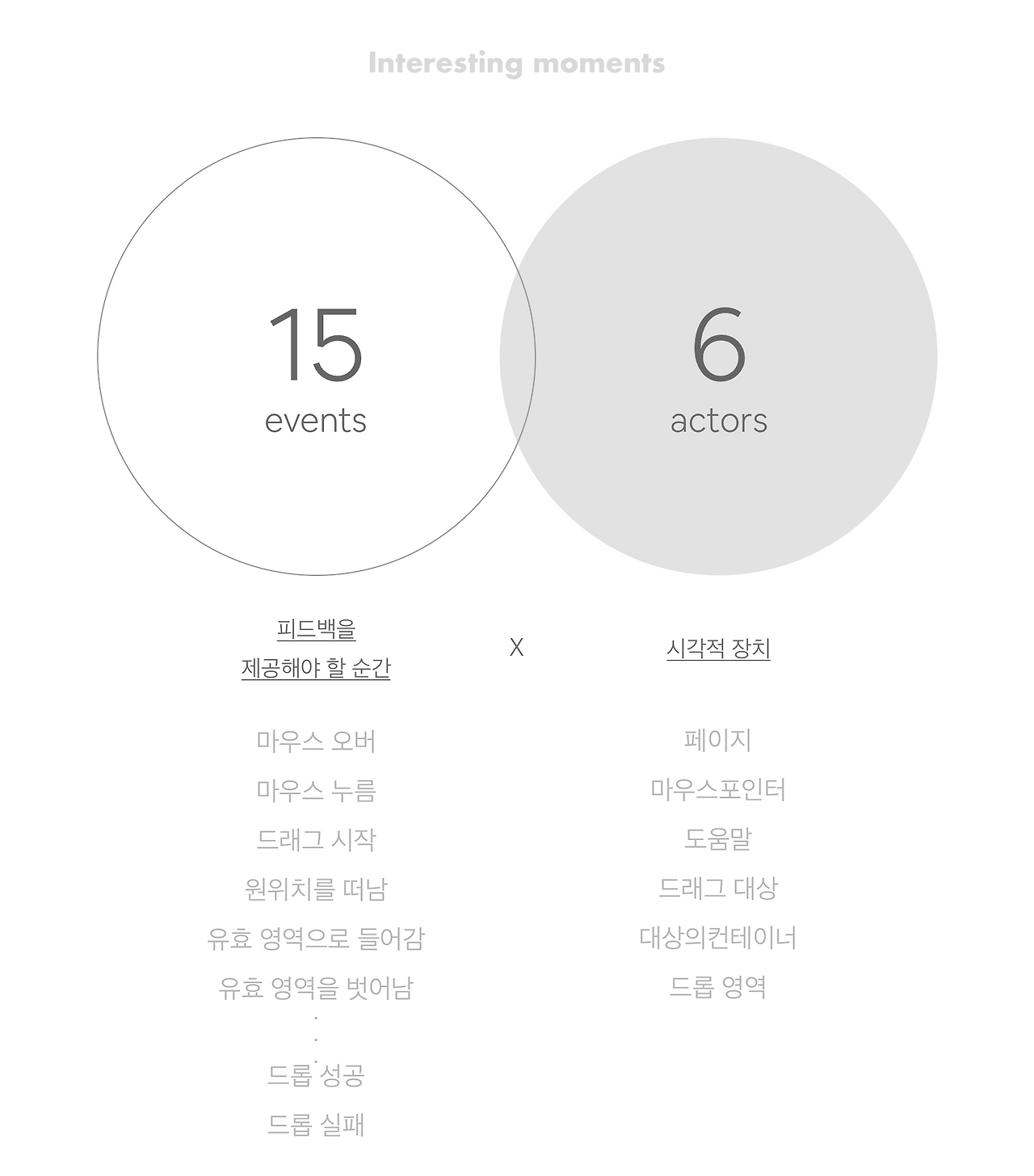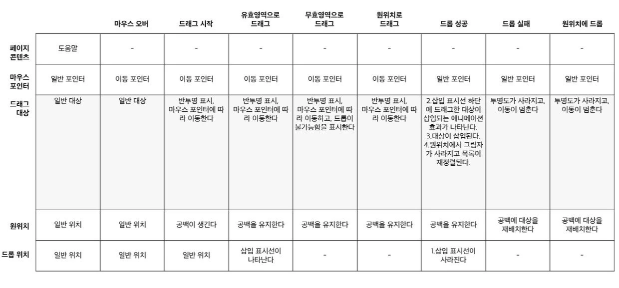 사용자가 드래그 앤 드롭을 하는 동안, 피드백을 제공해야 할 순간인 ‘event’가 최소 15가지 이상 발생할 수 있고, 이를 시각적으로 알려주는 6가지의 ‘actor’가 존재하기 때문에 최소 90가지의 상호작용 순간이 만들어질 수 있습니다. 이 모든 순간에 적절한 피드백을 주어야만 끊김 없는 사용자 경험을 제공할 수 있습니다.