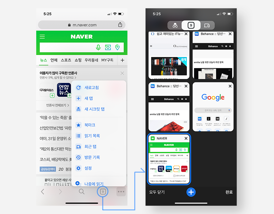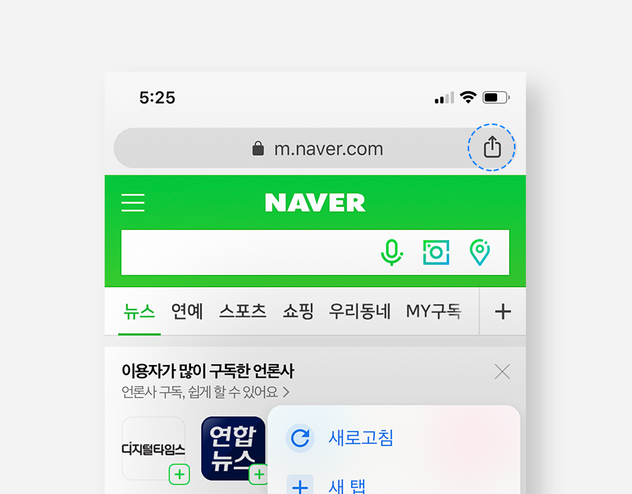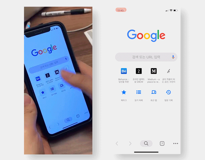 2. 제스처 노출 도구의 문제는 발견 가능성(Discoverability)이 낮다는 것인데, 이를 위해 제스처는 보조 수단으로만 두고 하단 메뉴바에 새로고침, 새창, 창닫기가 가능한 메인 루트를 뚫어놓았습니다.