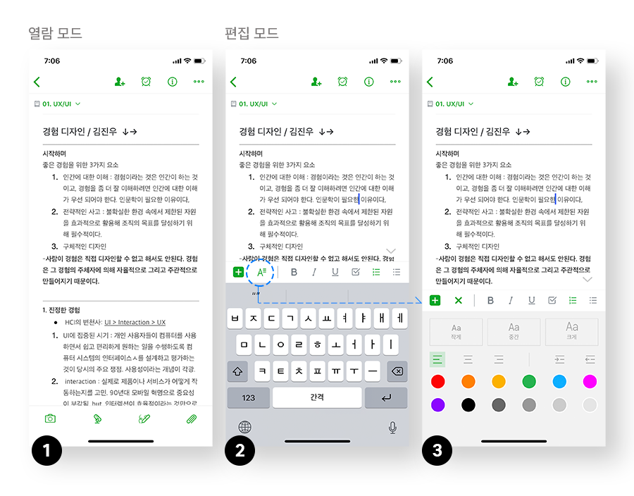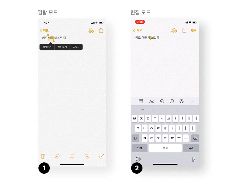 ❷본문을 탭 해서 편집 모드로 전환되면 키패드 상단에 텍스트 편집에 필요한 도구를 노출합니다.