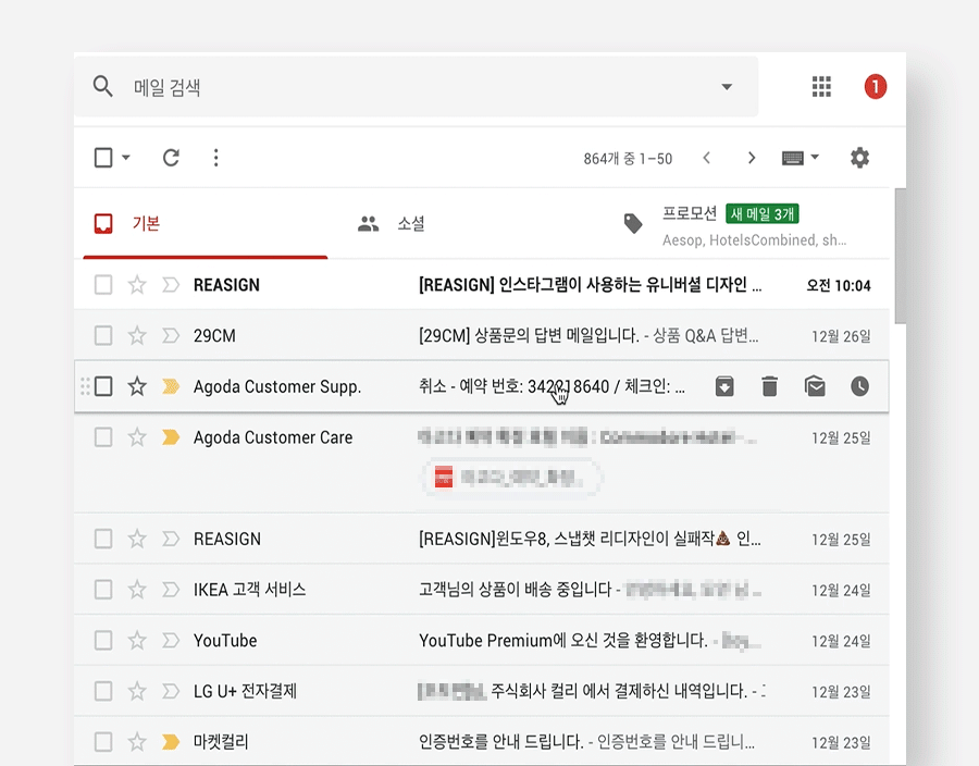 마우스 오버 노출 도구란, 주요하지 않은 기능일 경우 항상 노출하는 대신 필요할 때만 보이도록 하는 도구입니다. PC버전 사이트를 예로 들면, 지메일에서 메일 리스트 위에 마우스 오버 시 삭제, 보관 처리 같은 부가적인 기능을 노출하는 것을 들 수 있습니다.