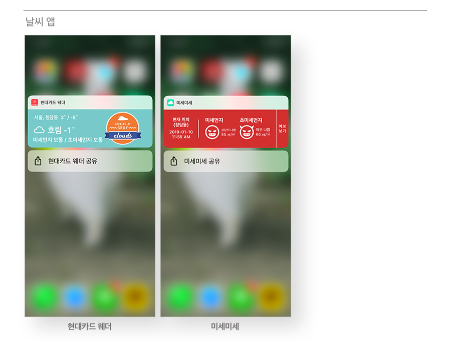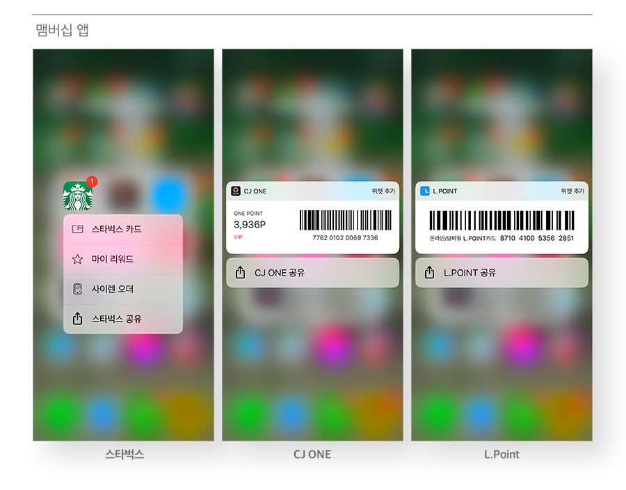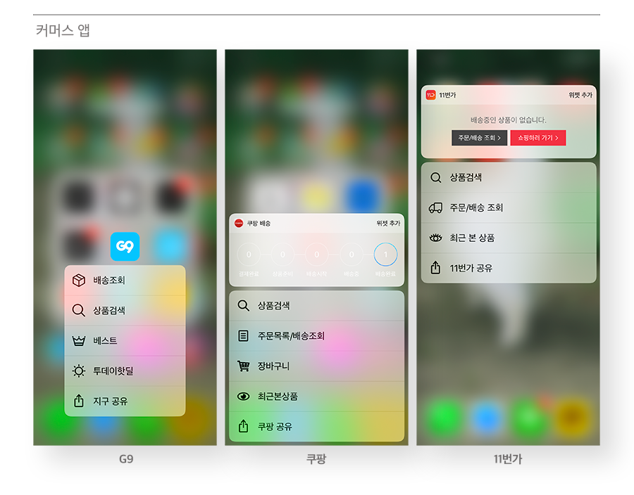 아이폰 앱들은 3D 터치를 통해 앱에 진입하지 않고도 핵심 기능에 접근할 수 있는 '바로가기'를 제공하고 있습니다. 같은 카테고리의 어플들은 서로 비슷한 바로가기 메뉴를 제공한다는 점도 재미있습니다. 날씨나 멤버십 어플은 위젯 형태로 원하는 콘텐츠(날씨정보, 멤버십 바코드)를 바로 불러와 주고, 커머스는 배송상태를 바로 알려주고 있습니다. 다만, 앱에 따라 정도의 차이는 보이네요. (스타벅스와 G9가 좀 심심해 보이죠?)