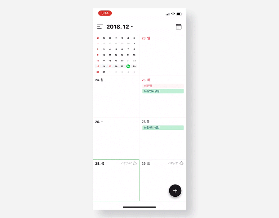 다만, 모드가 바뀌는 시점에 약간의 끊김이 발생하는 것이 보이시나요? 확대 축소의 기준점으로 느껴지는 우상단 일요일의 위치가 달라지는 것 때문인데요, 위치는 고정된 채로 폰트 크기만 부드럽게 줄어들었다면 조금 더 부드럽고 완성도 높은 전환 효과가 되었을 텐데 아쉽습니다.