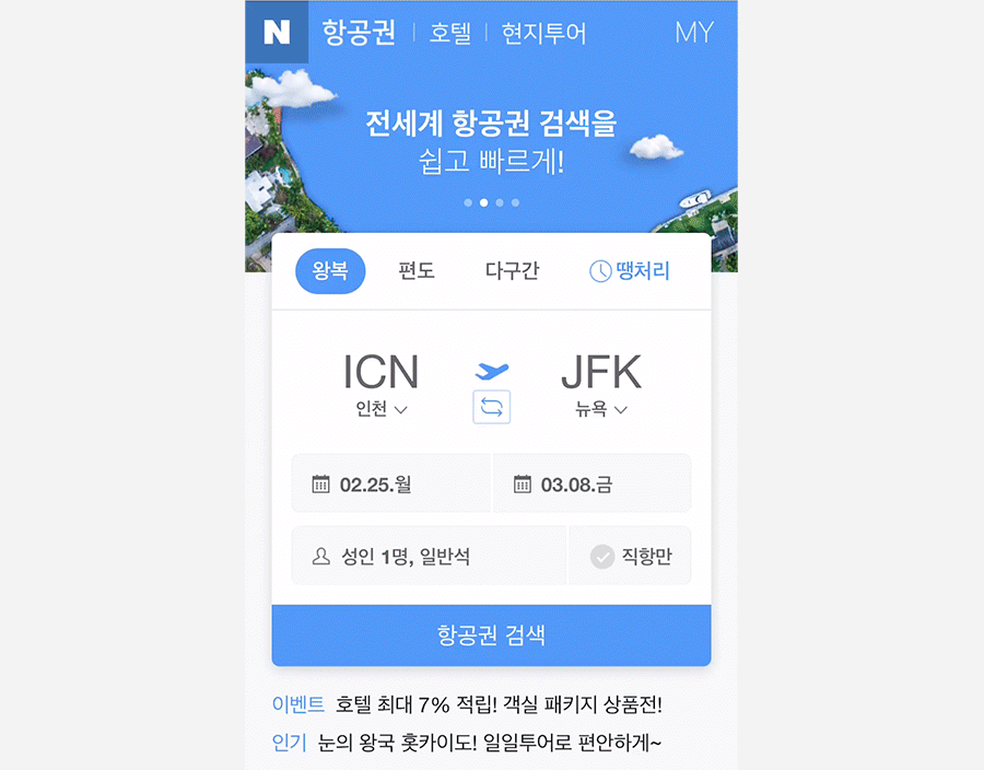 네이버 항공권 서비스는 비행기 모양의 프로그래스 바(Progress bar)와 안내 텍스트를 사용하여 항공권 검색 시에 소요되는 긴 로딩 시간을 지루하지 않게 채우고 있습니다.