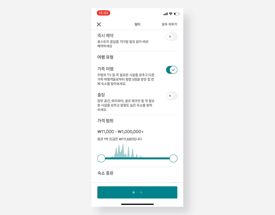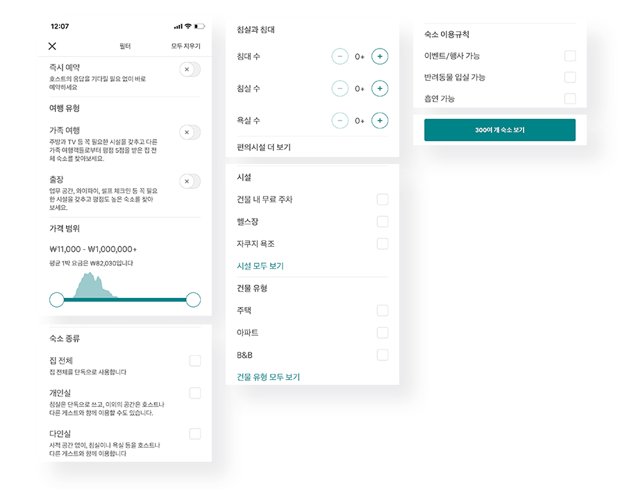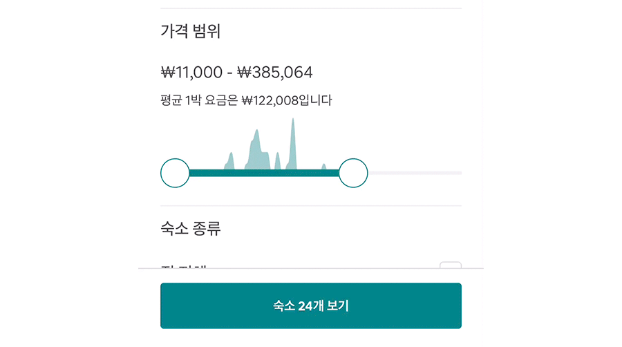 에어비엔비는 필터의 컨트롤러를 조작하는 즉시 하단 CTA버튼('nn여 개 숙소 보기'가 적혀있는 버튼)에 검색 결과값을 반영합니다. 그래서 보기 버튼을 누르고 필터 화면을 빠져나가기 전에 사용자가 몇 개의 검색 결과를 얻을 수 있는지 미리 알 수 있게 합니다. 만약에 검색 결과값이 0개일 경우, 현재 화면을 빠져나가지 않고도 필터를 재조작하여 유효한 값을 얻도록 유도하여 화면 전환을 최소화시키는 것입니다.