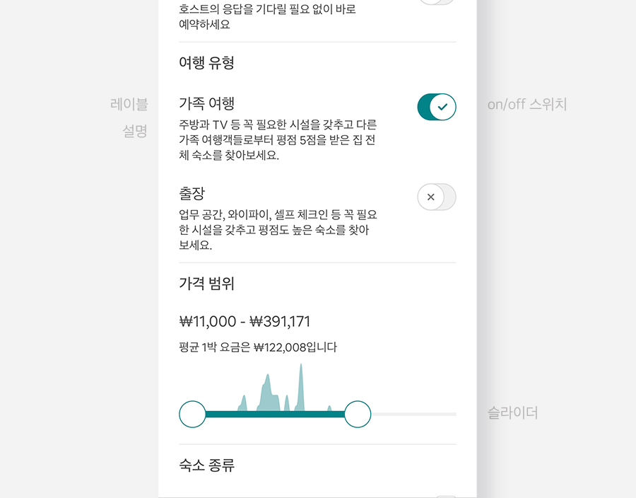 에어비엔비는 on/off의 피드백이 명확한 스위치와 직관적인 레이블, 그리고 상세한 추가 설명으로 해당 필터가 어떤 검색 결과를 불러올지 정확히 예측할 수 있게 합니다. 특히 조작이 어려울 수 있는 슬라이더도 직관적이고 조작하기 편한 방식으로 제공하고 있습니다. 슬라이더에 대해 책이 제시하는 몇 가지 유의사항을 살펴보겠습니다.