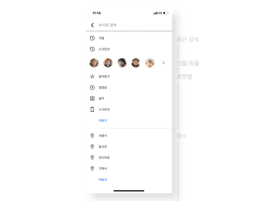 구글 포토는 검색 페이지 진입 시에 기본적으로 다양한 추천 검색어를 제공합니다. 위에서부터 최근 검색 기록/인물별/파일 포맷별/장소별로 추천 검색어를 제공하고 있습니다. 이러한 추천 검색어들은 자기가 찍은 사진을 텍스트로 검색하는 것이 어색한 사용자들에게 어떤 검색어가 가능한지, 어떤 방식으로 검색을 해야 하는지 가이드가 되어줍니다. 특히 인물별 검색어는 텍스트가 아닌 대표 이미지를 제공해 직관성을 높였습니다.