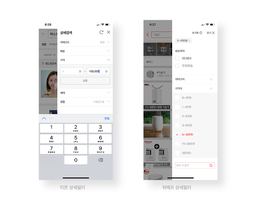 가격대 필터에서 입력 필드만을 제공하는 티몬의 경우, 최소값을 입력하지 않는다고 하더라도 '최댓값 필드 선택 > 원하는 가격 입력 > 설정 버튼 탭'의 최소 3단계를 거쳐야 합니다. 하지만 가격대를 체크박스로 선택하게 하는 위메프의 경우, 한 번의 탭만으로도 원하는 가격대의 상세 검색이 가능합니다. 정확한 입력이 필요한 상황에서는 입력 필드를 제공해야겠지만 대략적인 범위만으로도 상세 검색에 무리가 없는 경우에는 슬라이더나 체크박스 등 가벼운 인터페이스를 사용하는 것이 효율적이여보입니다.
