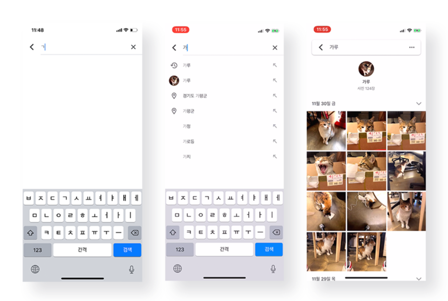 구글 포토는 입력 값과 동일한 값에 회색으로 강조표시를 하고 있습니다. 이는 어떤 검색어가 일치하는지 뿐 아니라 어떻게 일치하는지도 분명히 알 수 있게 합니다. 특히, 사용자가 이미 폴더링 해놓은 인물이나 동물의 경우 대표 이미지, 일종의 미리보기까지 함께 노출시켜주어 더욱 직관적이고 빠른 검색을 돕고 있습니다.