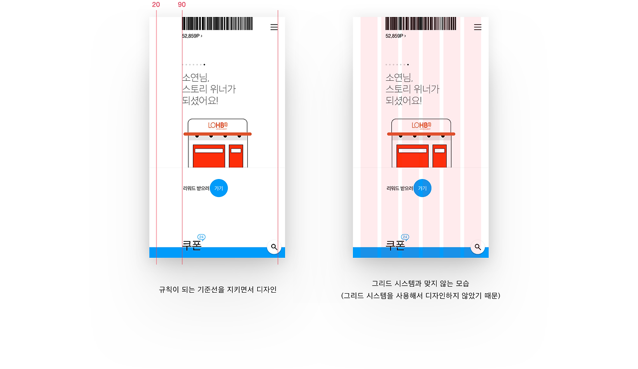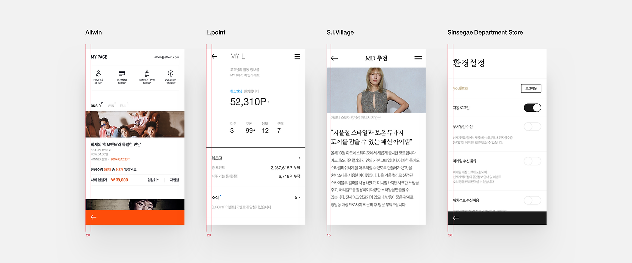 우리가 작업한 L.POINT 앱을 사례로 들어보면, 1x(360*640) 기준으로 좌우 마진 20, 메인에서 사용하고 있는 90, 이 두 가지 기준선을 이용해서 모든 화면을 디자인 했다. (아래 왼쪽 이미지 참고)