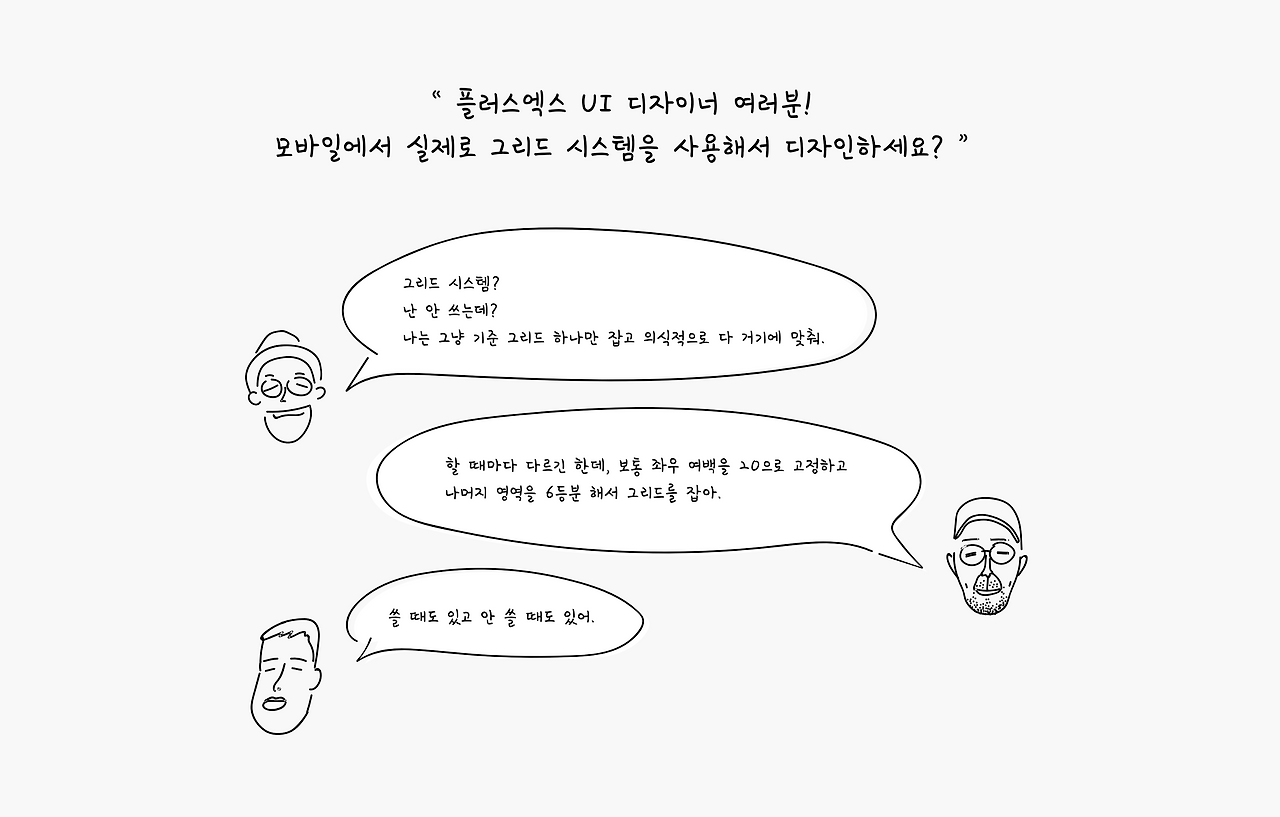 그렇다면 모바일에서 그리드 시스템을 사용하지 않고 디자인을 하고 있다면 잘못된 방식으로 디자인을 하고 있는 걸까? 필드에서 실무를 하는 디자이너들도 그리드 시스템을 효율적으로 사용하고 있을까?