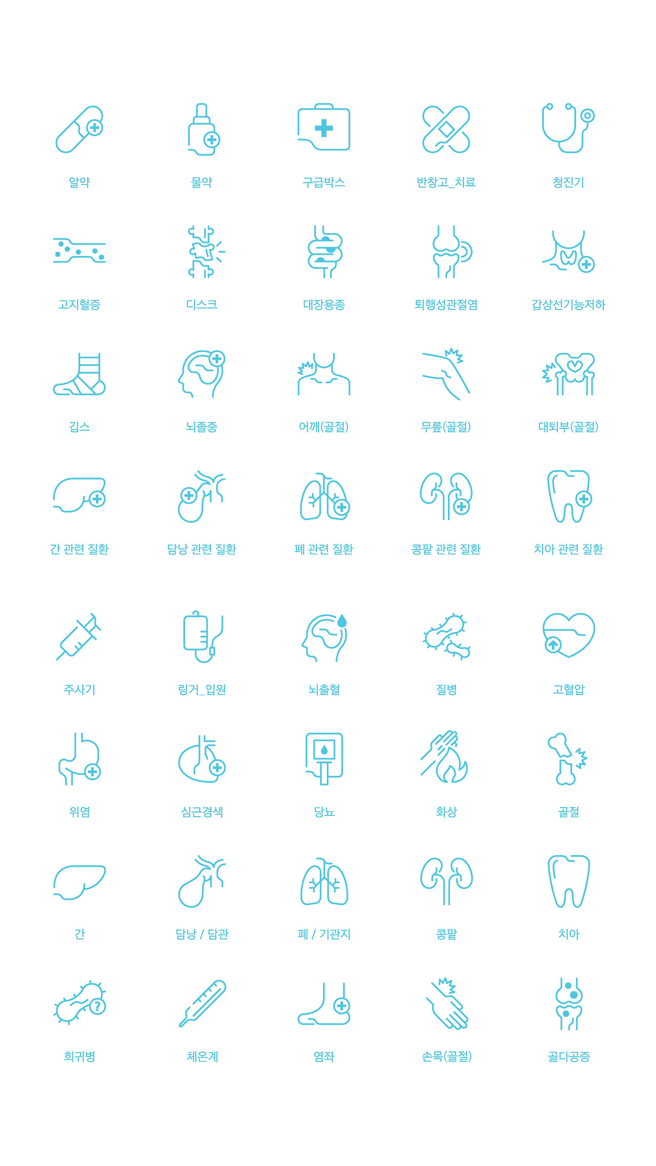 하나의 디자인 원칙을 기반으로 위와 같은 브랜드 아이콘을 전개하는 것. 뭐, 여기까진 통상적인 BX영역에서 다루는 이슈일 것이다. 그 이후, AX디자인은 우선 필요한 모든 아이콘을 제작한다. 말 그대로 모든... 삼성화재처럼 규모가 큰 기업은 그만큼 필요한 아이콘도 많다. 간단한 서류 아이콘부터 척추 디스크 아이콘까지.