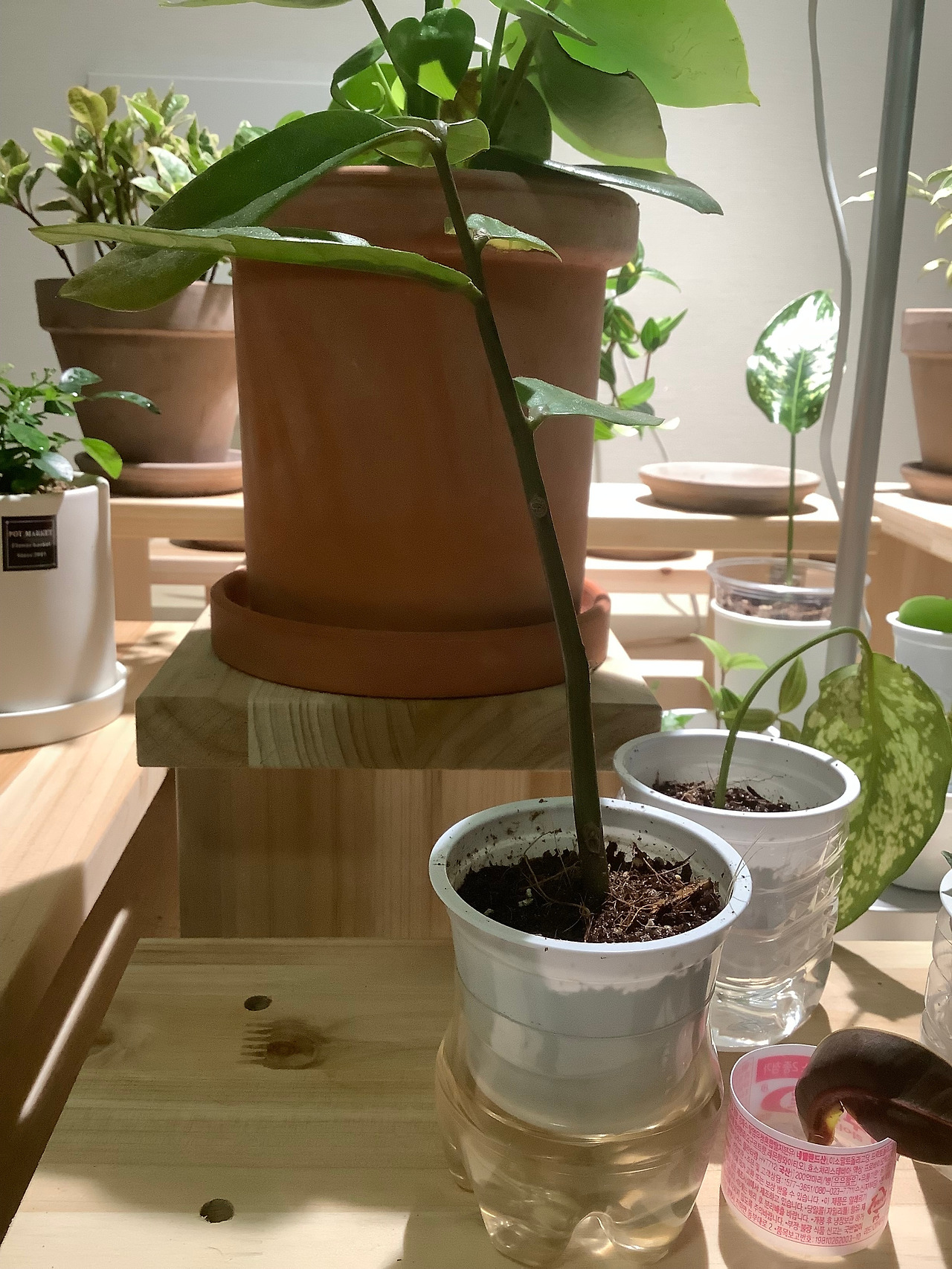 맨손으로 시들고 있는 금전수를 뽑아서는, 요플레 플라스틱에 미니화분을 만들고, 밑받침으로 500ml 생수병의 밑동을 잘라, 거기다 물을 담아놓고는 항상 촉촉하게 흙 상태를 유지했다.